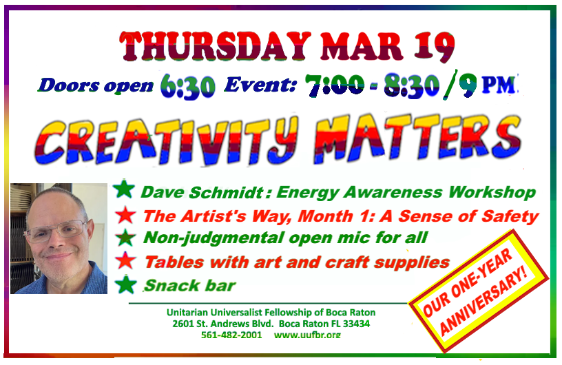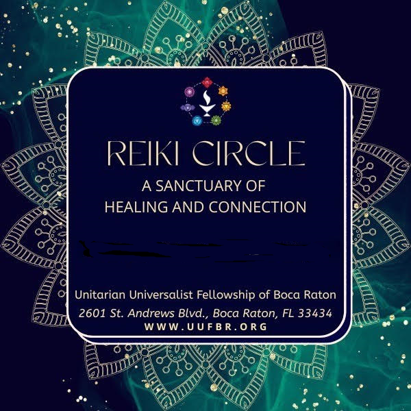Reiki Circle at UUFBR – A Sanctuary of Healing and Connection Step into a sacred space of peace, presence, and energy renewal. Join us for a Reiki Circle at the Unitarian Universalist Fellowship of Boca Raton, where hearts open, healing flows, and community blossoms. Whether you’re new to Reiki or an experienced practitioner, all are welcome to receive, share, and experience the gentle power of universal life force energy. Come as you are—leave lighter, calmer, and more connected. Love donations graciously accepted.