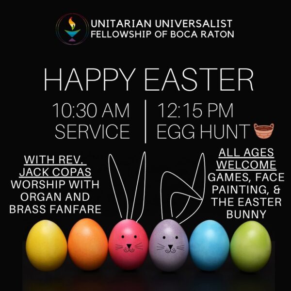 Jesus was a great teacher long, long ago who preached God’s love. Jesus taught that we should care for the poor and forgive people who hurt us. In his lifetime, Jesus influenced many people to love one another as they loved God. In Jesus’ time, the Roman leaders and the Jewish leaders did not like him. They were afraid he would lead a rebellion and upset the way things were. The night before Jesus died, he was celebrating the Jewish holiday of Passover. The next day, Jesus was arrested, and then he was killed. What happened after Jesus died began the religion we know as Christianity. Many Christians believe that after Jesus was killed, he rose from the dead and went to heaven. Unitarian Universalists believe that Jesus of Nazareth will never again live on Earth. His body is not coming back. But his spirit never needs to die. His spirit is in his words and deeds which still give us wisdom on Easter Sunday. For example, when he was alive, Jesus taught The Golden Rule: Treat others the way you want to be treated. Jesus gave the Sermon on the Mount, where he said that people who are poor, hurt, and struggling are loved by God and therefore, we must love them, too. Easter Egg Hunt & Celebration Join us after worship for a joyful Easter Egg Hunt and community celebration! Beginning at 12:15 PM, children and families are invited to explore the grounds in search of hidden eggs—including a special Golden Egg prize. Enjoy games, activities, photos with the Easter Bunny, and festive treats during an outdoor coffee hour. We’ll also be collecting donations for the Pet Food Bank Program at Animal Care & Control—bring unopened pet food (dry or canned) or toys, if you can, to help fill the Big Bunny Basket and support beloved companions in our wider community. If you’re able to lend a hand with setup, activities, or clean-up, your help is deeply appreciated. All are welcome to share in the fun, connection, and springtime joy. |