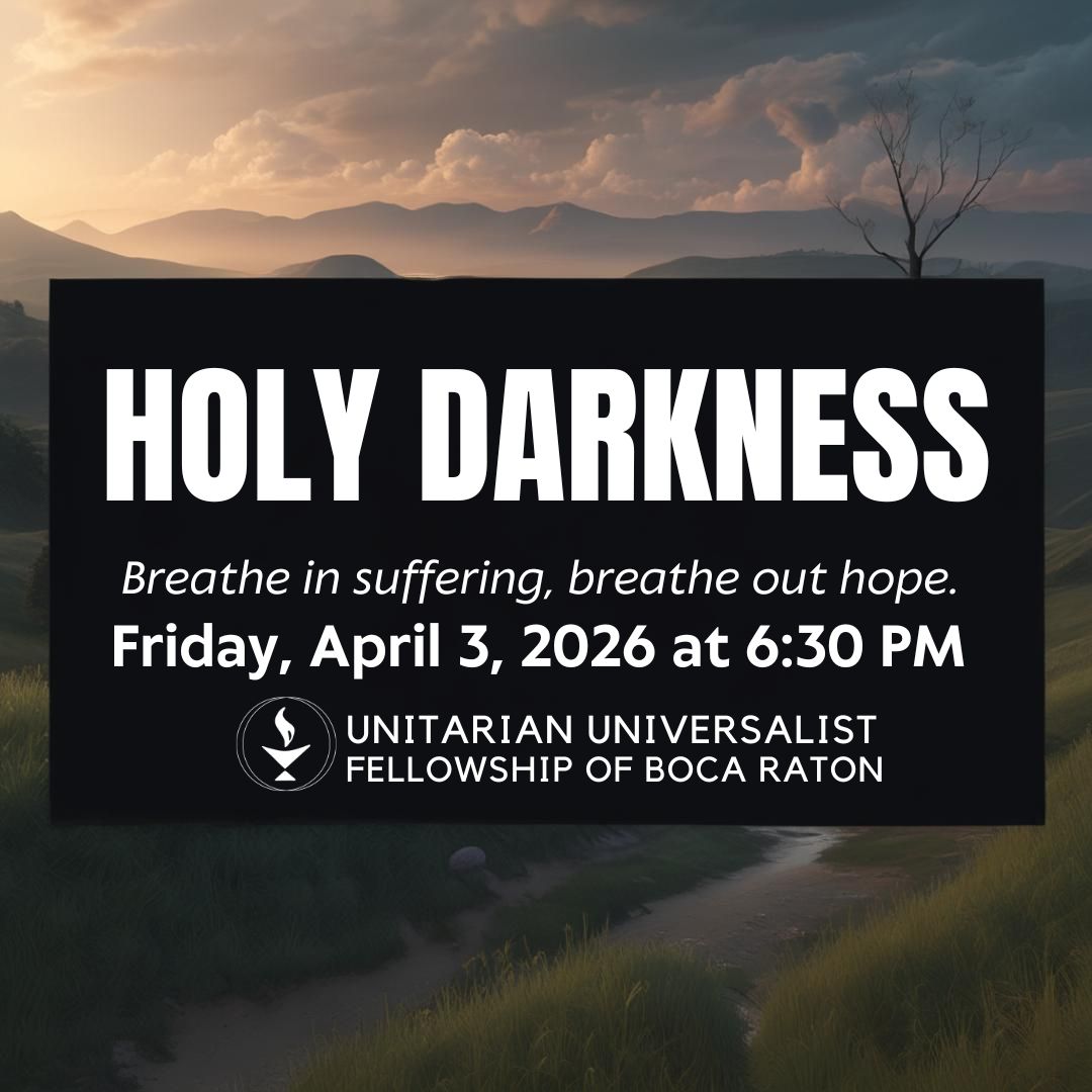 | Join us on Friday evening, April 3rd in a contemplative UU Tenebrae service at sunset with stillness, solemn song, and an inward search to transform awareness of grief. Join us in the holy darkness for meditation and music, to breathe in the world’s suffering and breathe out compassion. | |